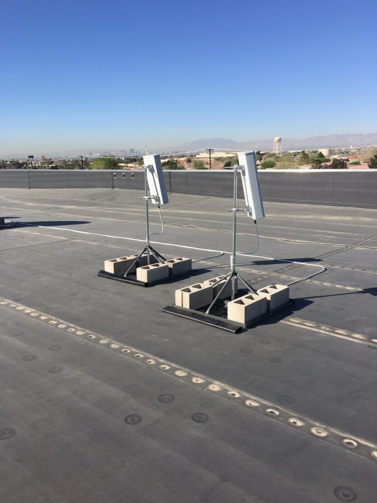 Pair of sector antennas installed on roof of building. Dual antennas ensures a good lock on the azimuth for the carriers that need to be supported.
