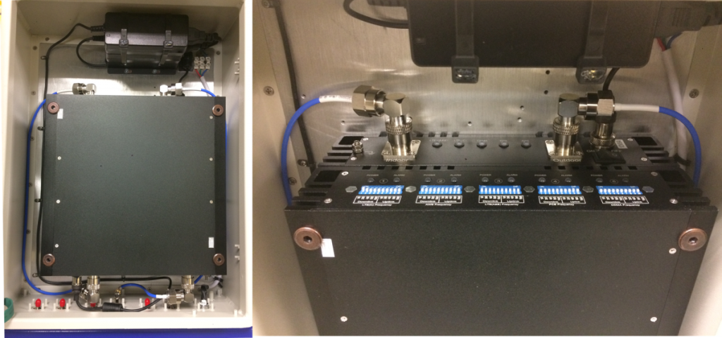 Customized quad band repeater and pre-amp enclosed in IP65 enclosure for O-DAS deployments. All Low PIM cables used.